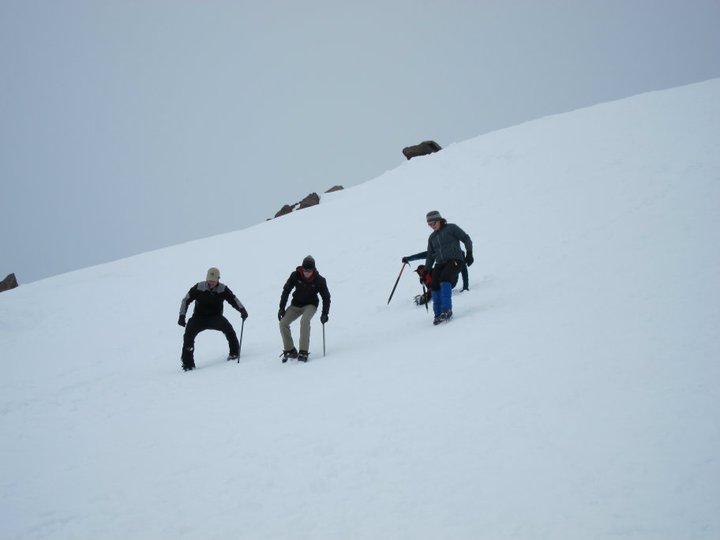 Sunday was a pretty easy day for us. We woke up around 7 and had a fantastic breakfast of pancakes and bacon, then headed outside for some training exercises. We went over different crampon walking techniques for different steepness levels, how to walk when roped in with your rope team, and the most fun of all – ice axe arrest positions! This consisted of pretending to slide down the mountain, flipping over, and digging your ice axe into the side of the mountain to stop yourself. Ironic that this was the most fun because having to do an ice arrest as you fall down the mountain for real would have been not fun…at all.